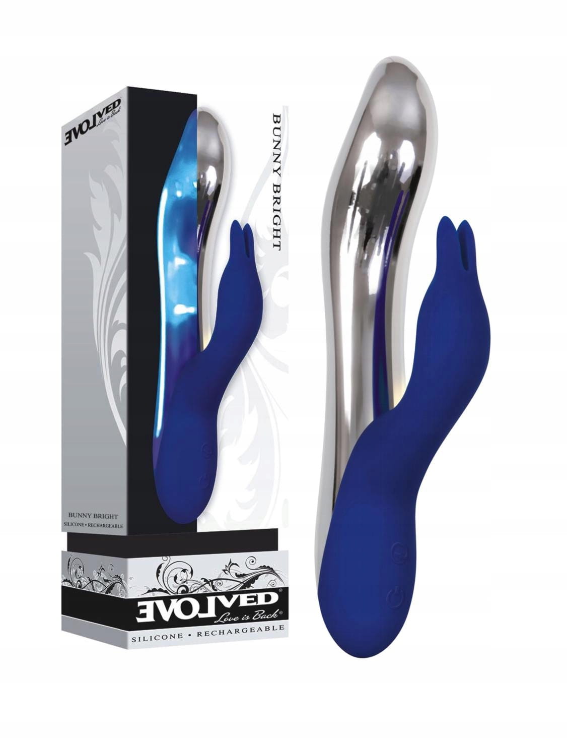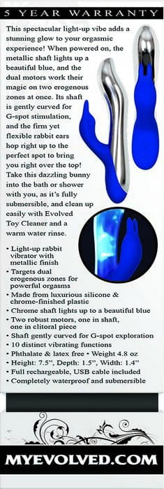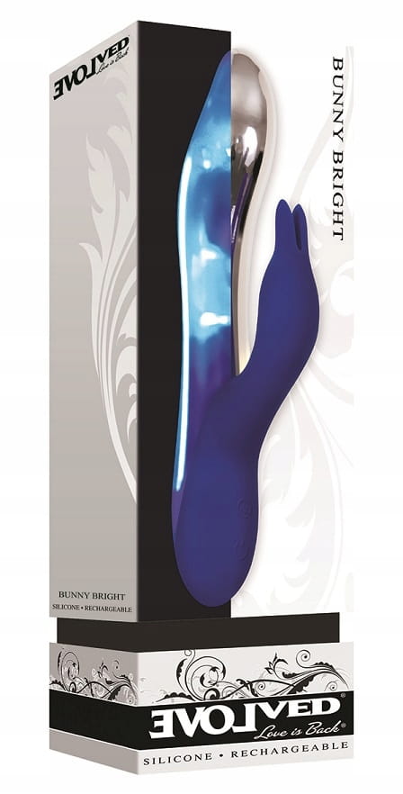Po włączeniu Bunny Bright metaliczny trzon wibratora zaczyna świecić pięknym niebieskim światłem, a 2 mocne silniki ( jeden w wale a drugi w stymulatorze ) działają magicznie na obu Twoich strefach erogennych jednocześnie !