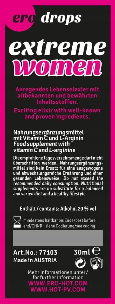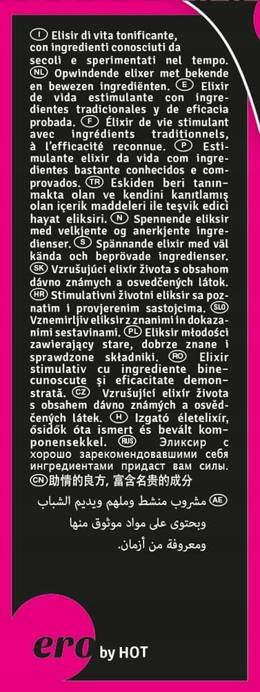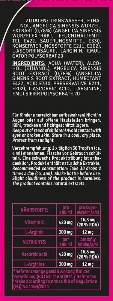 Sekret działania tkwi w naturalnej recepturze : Dzięgiel Chiński (Dong Quai), L-Arginina, witamina C poprawiają witalność i zapewniają szybki wzrost libido. Dzięgiel Chiński jest często nazywany ,,kobiecym żeń-szeniem", gdyż zawiera fitoestrogeny, kumaryny, sacharozę, witaminy A, B2, B12, E, żelazo i magnez. Kumaryny rozszerzają naczynia krwionośne, zwiększają ukrwienie macicy oraz innych narządów wewnętrznych. Działają stymulująco na ośrodkowy układ nerwowy. Zmniejszają również skurcze mięśni dzięki czemu dzięgiel łagodzi dolegliwości kobiece, wykazuje również działanie lekko uspokajające. Zawarta w kroplach L-arginina to tzw. ,,aminokwas doskonały" który bierze bardzo czynny udział w wielu procesach metabolicznych. Ma szereg bardzo ważnych zadań, gdyż wzmacnia organizm, działa pobudzająco, zwiększa energię seksualną oraz odczuwanie większej rozkoszy. Polepsza życie seksualne oraz przedłuża aktywność seksualną. Jako prekursor tlenku azotu arginina może ułatwić orgazm i zwiększyć wrażliwość na bodźce seksualne. Dawkowanie : wstrząsnąć butelką, 30 kropli ( około 4 ml ) wlać pod język lub do napoju na 20-30 minut przed stosunkiem. Produkt zawiera naturalne ekstrakty. Nie należy przekraczać zalecanej dawki spożycia dziennego, czyli 2 x 4 ml w ciągu dnia. Suplementy diety nie mogą zastąpić zrównoważonej i zróżnicowanej diety i zdrowego trybu życia. Przechowywać w miejscu niedostępnym dla dzieci. Przechowywać w chłodnym, suchym miejscu. Chronić przed światłem słonecznym.