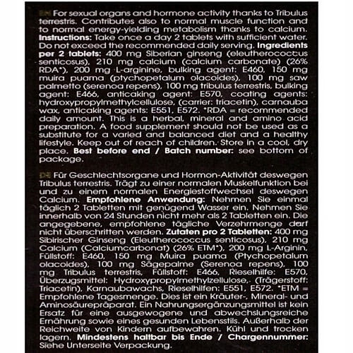 Składniki tabletki : Żeń-szeń syberyjski, Wapń ( węglan wapnia ), L-Arginina, substancja wypełniająca : E460, Muira Puama, Palma sabałowa, Buzyganek naziemny, substancja wypełniająca : E466, substancja przeciwzbrylająca : E570, substancja glazurująca : hydroksypropylometyloceluloza; ( nośnik: triacetyna ), wosk Camauba, substancje przeciwzbrylające : E551, E572.
