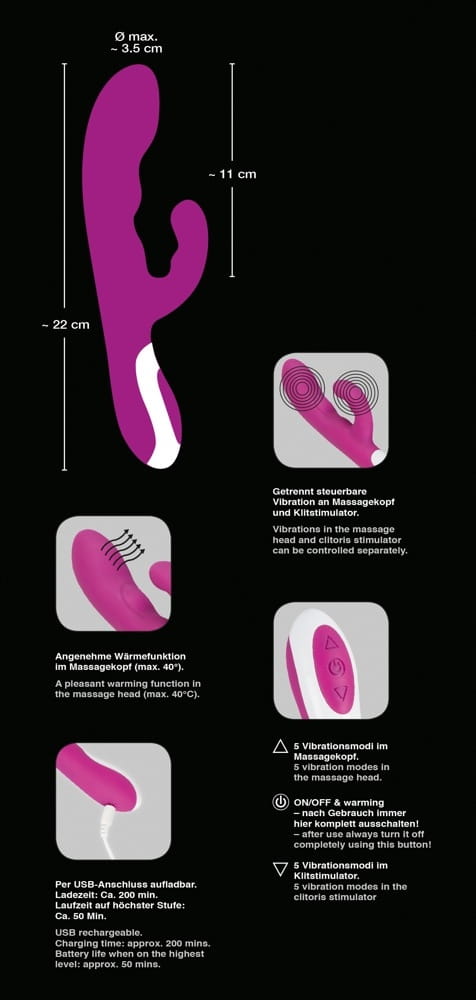 Specjalnym wyróżnieniem jest funkcja ogrzewania w końcówce : końcówka nagrzewa się do przyjemnego 42 ° C, gdy tylko wibrator zostanie włączony.