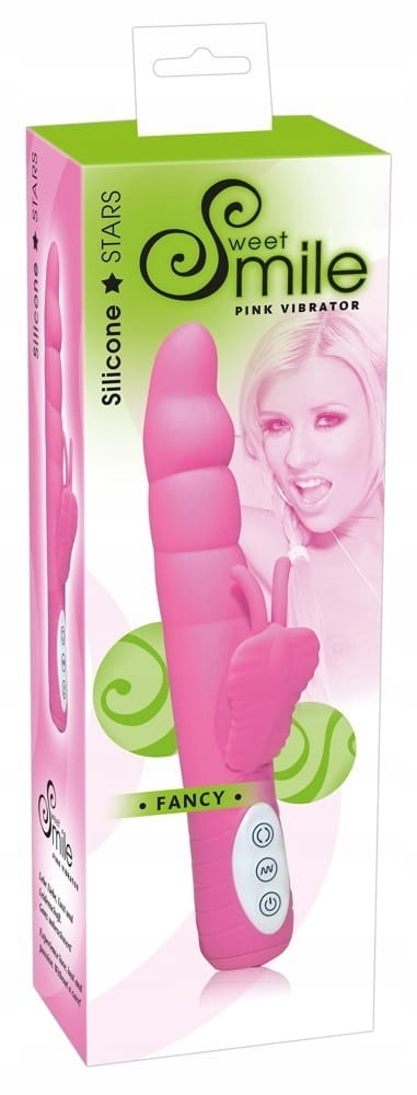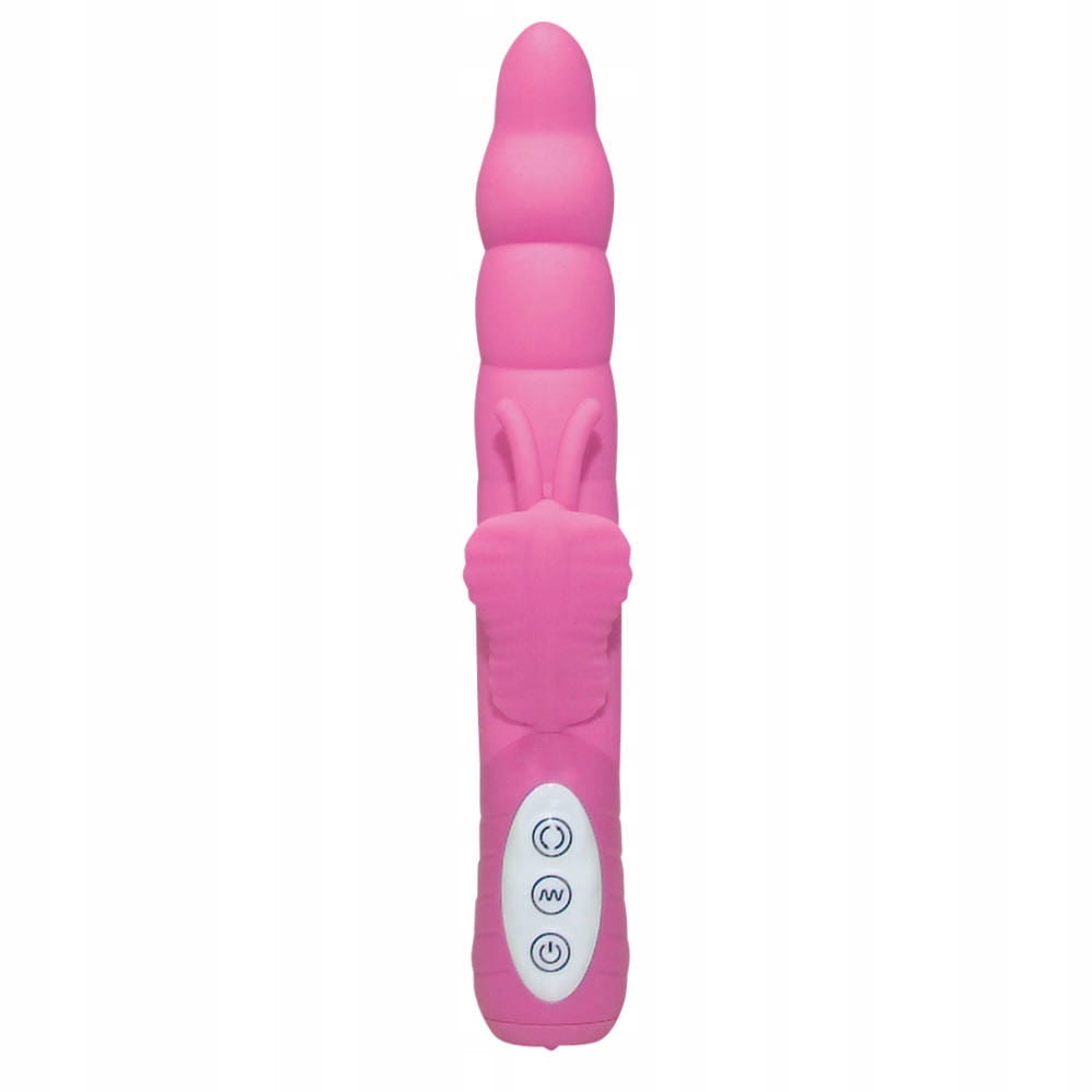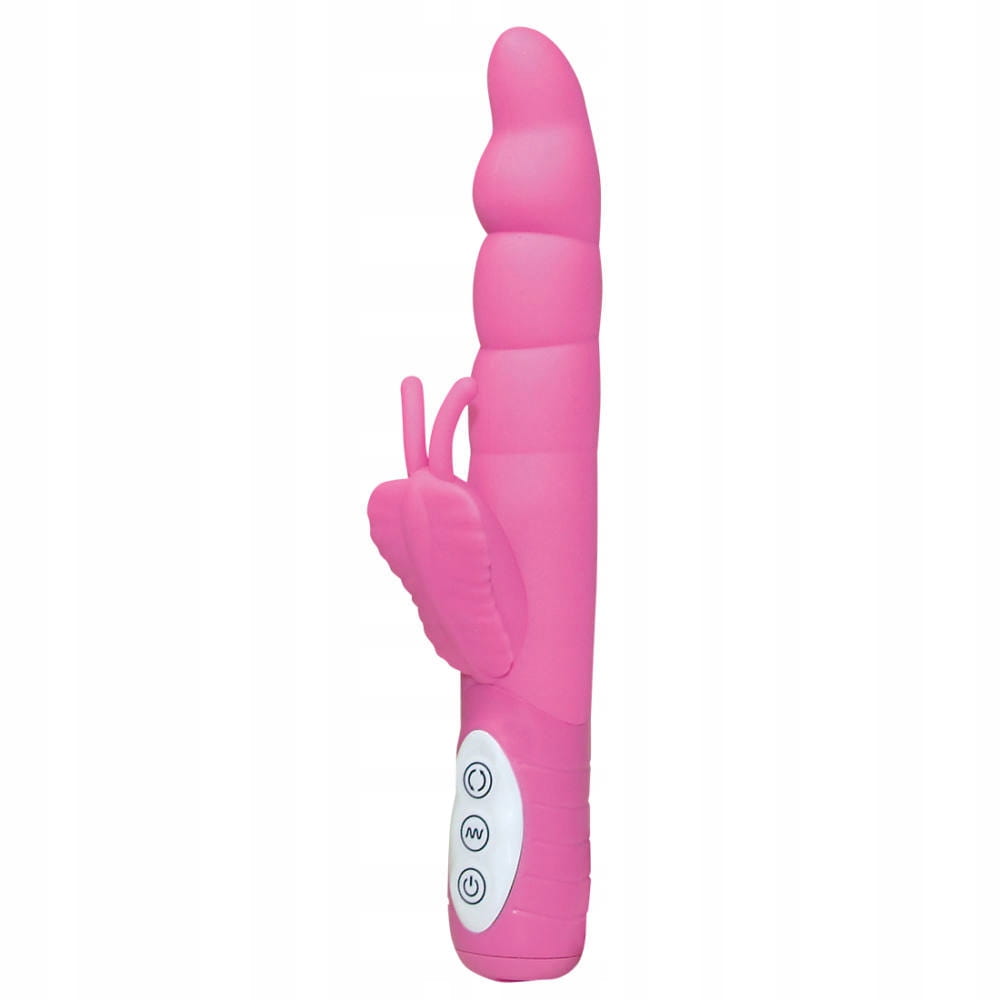 Słodki, silikonowy wibrator z funkcją rotacji oraz stymulatorem łechtaczki w kształcie małego motylka. Trzon wibratora posiada dodatkowo specjalne stymulujące pochwę rowki.