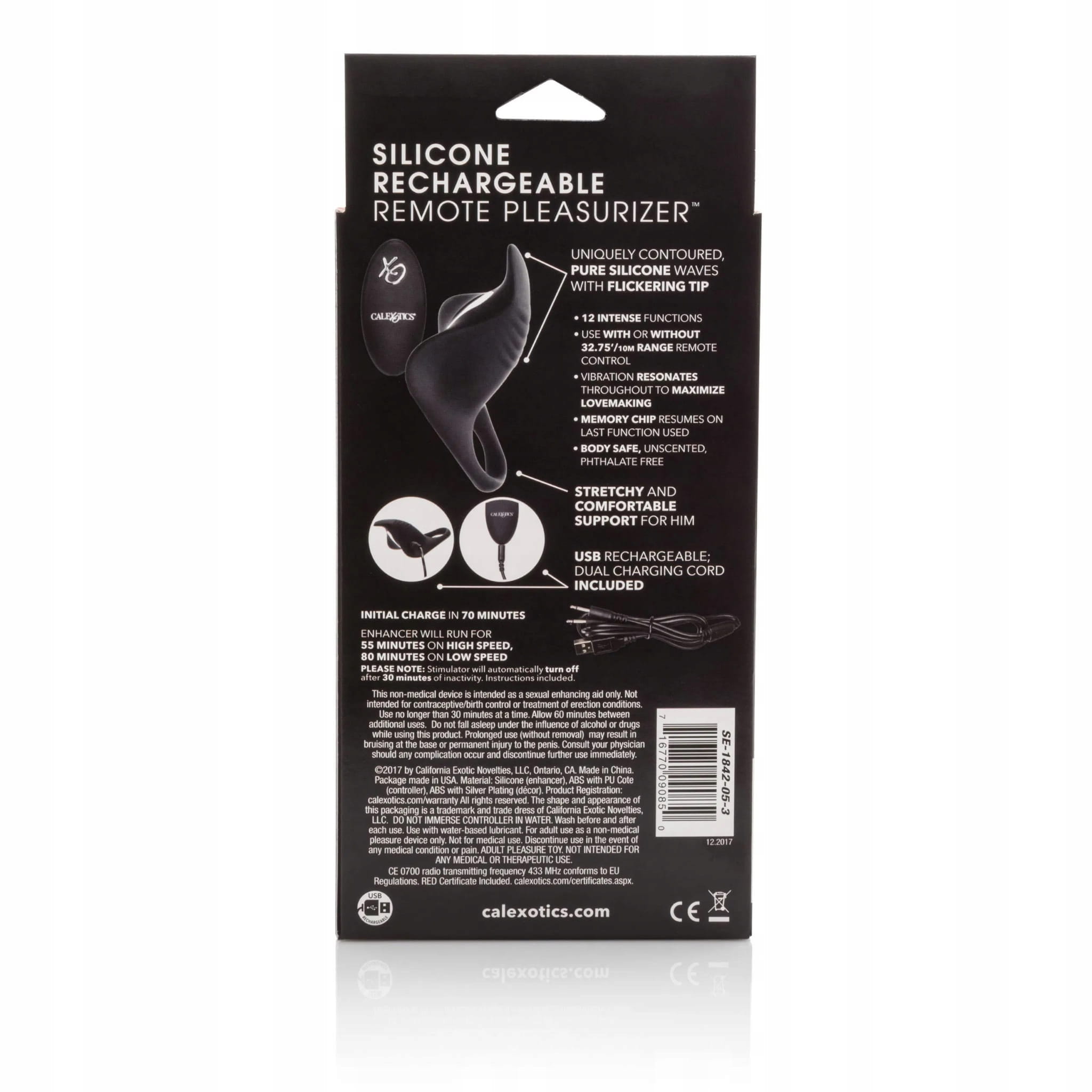 Zwiększ satysfakcję erotyczną i przyjemność z silikonowym zestawem - wibrujący, silikonowy pierścień na penisa sterowany bezprzewodowym pilotem. 12 rodzajów bardzo intensywnych funkcji ukrytych w pierścieniu na penisa zapewnia ekscytujące i podniecające obojga Partnerów wibracje, pulsacje i eskalacje. Pierścień wykonany jest z miękkiego i elastycznego, bezzapachowego silikonu medycznego typu premium. Bardzo dobrze dopasuje się do obwodu każdego penisa. Pomoże skutecznie zwiększyć erekcję, oraz powstrzymać kłopotliwy, przedwczesny wytrysk. Zdobądź wsparcie którego potrzebujesz, aby uzyskać super mocny orgazm i przedłużyć miłosną grę, dzięki delikatnemu efektowi przekrwienia wynikającemu z blokowania i spowolnienia odpływu krwi z penisa. Kształt pierścienia z rozbudowaną końcówką wibrująco-stymulującą ma lekko teksturowaną i pofałdowaną powierzchnię służącą do stymulacji. Wypróbuj moc tego wodoodpornego pierścienia w wannie, pod prysznicem lub w jacuzzie z hydromasażem, używając bezprzewodowego pilota o zasięgu do 10 m. Remote Pleasurizer posiada także najnowocześniejszy układ pamięci, który zapamiętuje i uruchamia ostatnio używaną funkcję. Naładuj wysokiej jakości silikonowy pierścień na penisa dołączonym do zestawu kablem USB w ciągu 70 minut, aby mieć aż 55 minut silnej stymulacji, lub 80 minut wibracji o niskim natężeniu. Unikaj używania lubrykantów silikonowych, olejków i środków poślizgowych na innej bazie niż woda, aby uniknąć uszkodzenia silikonowej powierzchni. Do umycia użyj ciepłej wody i delikatnego mydła, lub środka dezynfekującego zabawki erotyczne typu ToyCleaner.