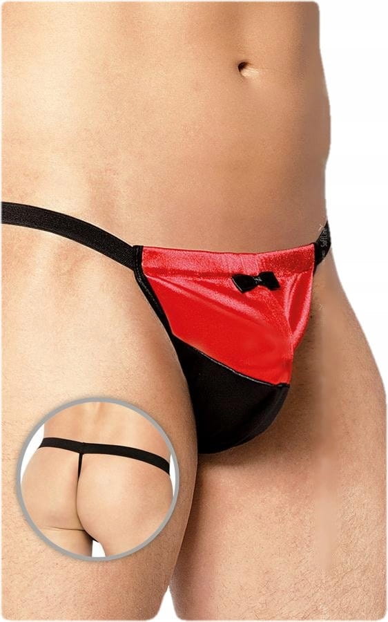 Eleganckie, męskie stringi z muszką w kolorze czerwono-czarnym.