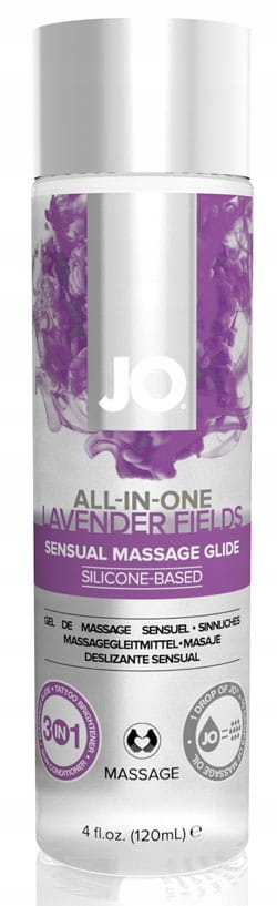 ŻEL DO MASAŻU SYSTEM JO ALL-IN-ONE LAVENDER 120 ML Żel do masażu System JO® all-in-one lavender wyróżnia się silikonową formułą, która jest niezwykle wydajna. Jedna niewielka kropla żelu jest równa 10 kroplom tradycyjnego olejku do masażu! Jego jedwabista konsystencja dodatkowo zwiększa doznania płynące z masażu. Dzięki wodoodporności kosmetyku masaż można wykonać również pod prysznicem czy w trakcie relaksującej kąpieli. Delikatny, lawendowy zapach żelu unosi się powietrzu, wprowadzając zmysłową atmosferę. Co ciekawe, żelu System JO® all-in-one lavender można używać także jako odżywki do skóry oraz rozświetlacza do tatuażu. Kosmetyk nie zawiera parabenów i gliceryny. Nie wywołuje reakcji alergicznych ani podrażnień skóry. Nie należy stosować żelu do masażu z silikonowymi zabawkami erotycznymi oraz lateksowymi prezerwatywami, ponieważ może uszkodzić ich powierzchnię. Cechy: