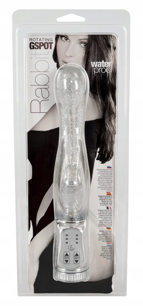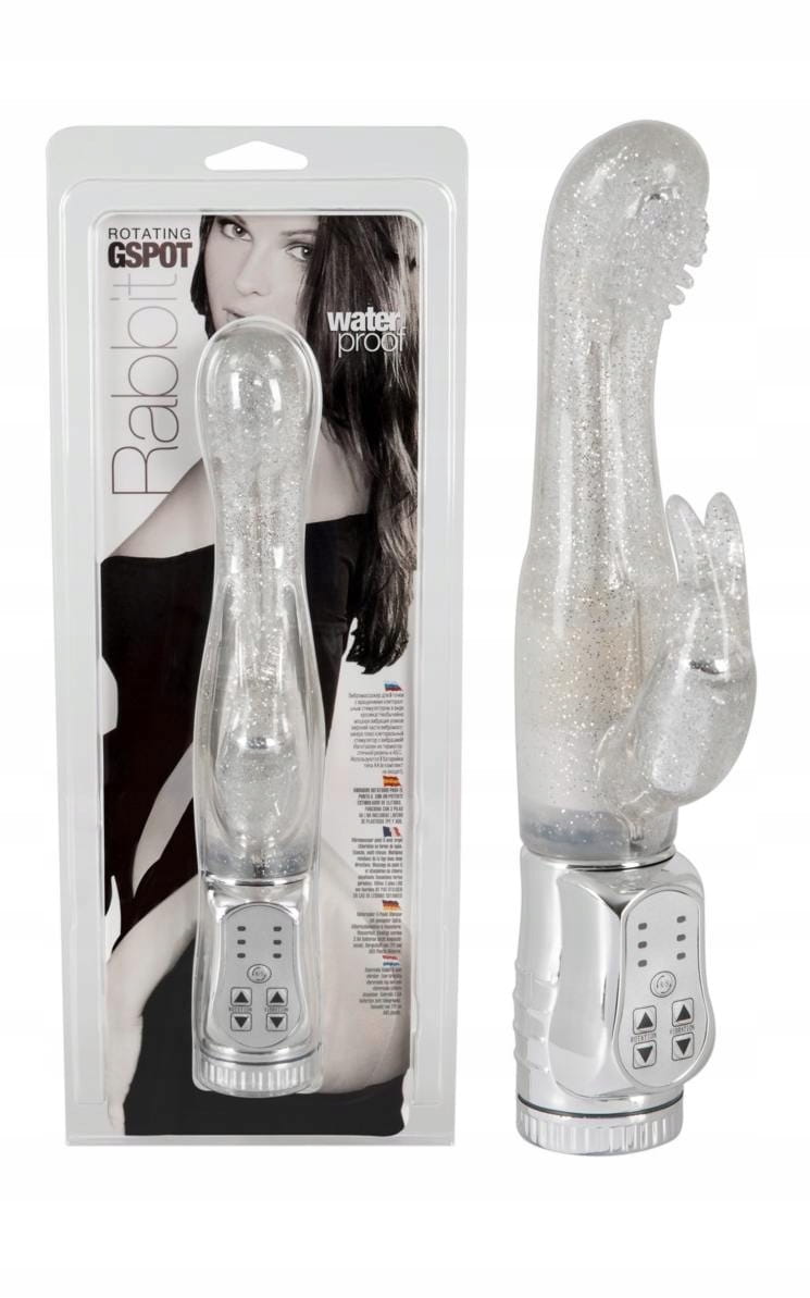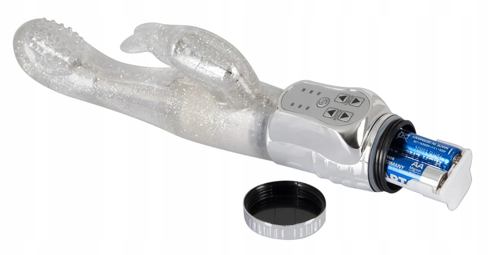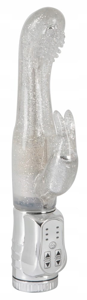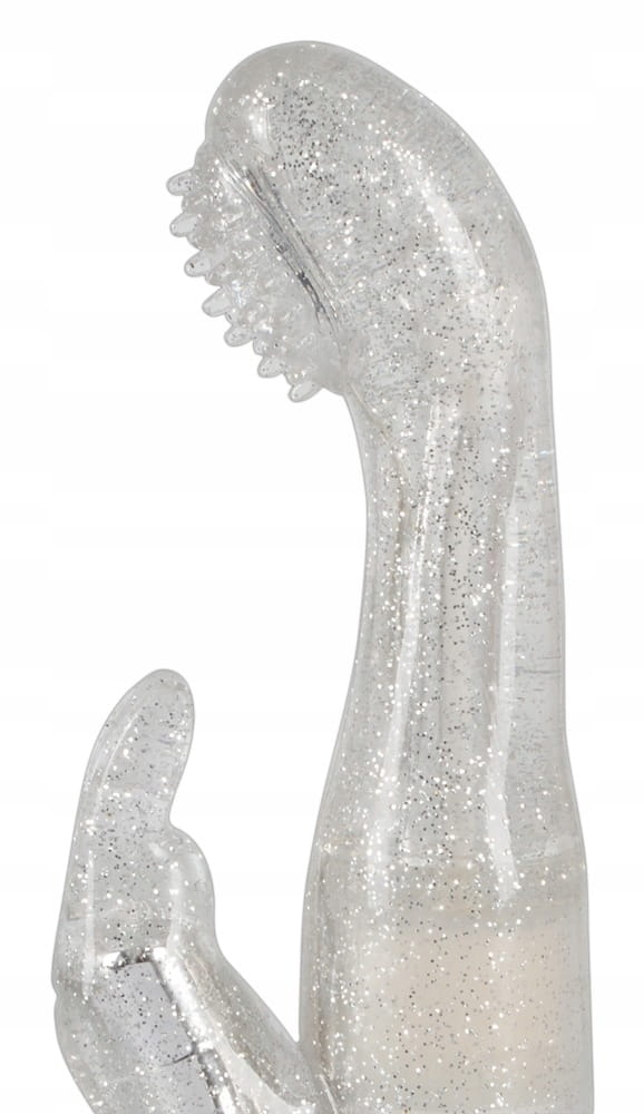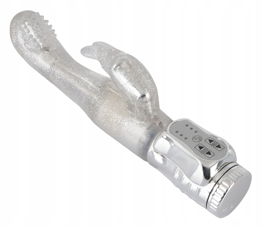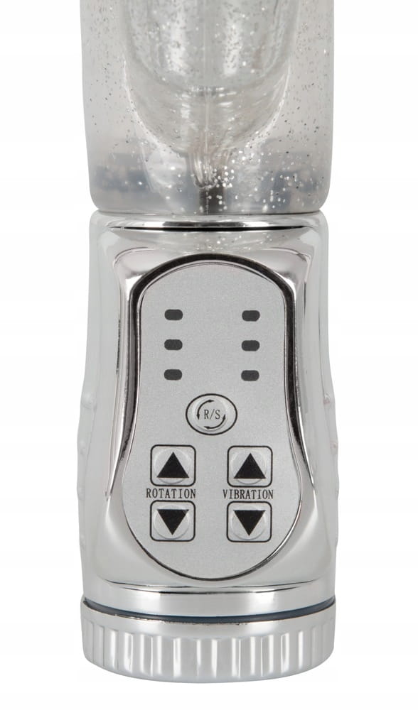 Wszechstronny relaks w srebrnym brokacie ! Wodoodporny wibrator ze specjalnie uformowaną, pulchną i pokrytą stymulującymi wypustkami końcówką, która obraca się i skręca głęboko, masując szczególnie efektywnie punkt G. W tym samym czasie stymulator łechtaczki w kształcie króliczka podniecającymi wibracjami prowadzi Cię do krainy mega orgazmów. Więcej stymulacji na raz nie jest możliwe ! Wibracja i rotacja w lewo / w prawo w 3 różnych prędkościach jest wygodnie kontrolowana przez naciśnięcie przycisku na intuicyjnym panelu sterowania.