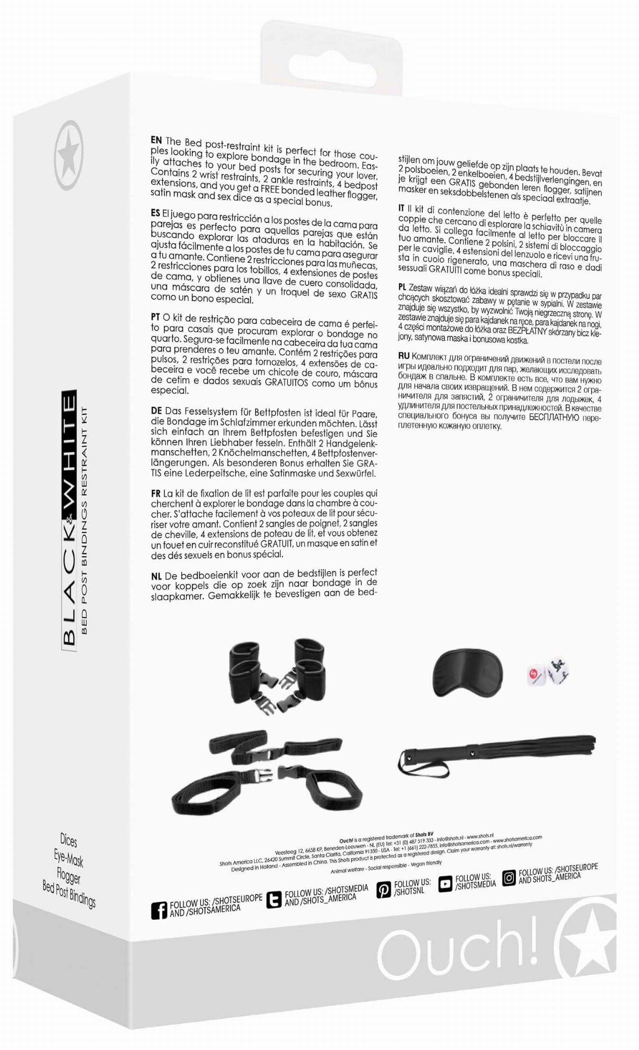 ZESTAW DO KREPOWANIA W ŁÓŻKU BED POST BINDINGS Lubisz erotyczne gry bondage ? Jeśli tak, to ten bardzo elegancki zestaw do krępowania w łóżku jest koniecznością ! Teraz to Ty możesz zdecydować co zrobić, aby Wasze doświadczenia erotyczne były niesamowite ! Uzyskaj doskonały dostęp do wszystkich wrażliwych na dotyk miejsc. Brak ruchu potęguje wszystkie odczucia, których doświadczasz. Szept dominanta w Twoim uchu będzie jeszcze bardziej rozkoszny i pełen pożądania. Oddech będzie cieplejszy i bardziej promienny na Twojej skórze. Dotyk skóry na Twojej skórze będzie bardziej elektryzujący niż zwykle. Ograniczenia są niesamowitym sposobem na zwiększenie zaufania, pogłębienie więzi emocjonalnych i poznanie pragnień w zupełnie nowy sposób ! W zestawie znajduje się para kajdanek na ręce, para kajdanek na nogi, 4 elementy montażowe do łóżka, skórzany pejcz, satynowa maska oraz kostka do gry. Materiał: Poliester, Akryl, Skóra, Plastik Kolor: czarny