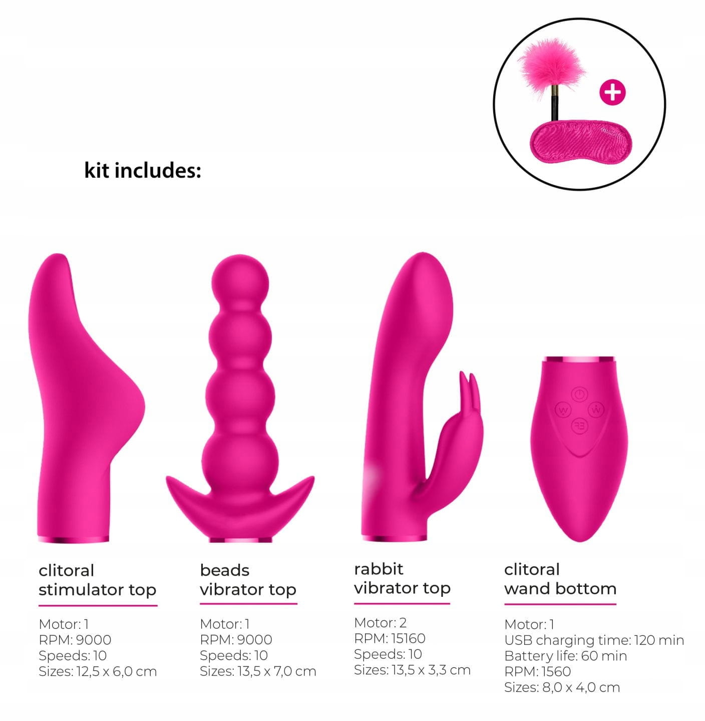 Wystarczy nałożyć wybraną końcówkę na podstawę i jesteś gotowy do gry ! Końcówka do masażu łechtaczki ma lekko spiczastą głowę z dwoma bocznymi skrzydełkami dla dodatkowej stymulacji. Końcówka do analnej penetracji z koralikami otwiera cały świat możliwości. Dzięki zwiększającej się średnicy 4 kulek z szeroką podstawą, świat orgazmu jest w zasięgu ręki ! Użyj go analnie lub dopochwowo, wybór należy do Ciebie. Wibrator ze stymulatorem łechtaczki w kształcie króliczka ma specjalnie wyprofilowaną główkę do stymulacji punktu G. Zarówno wymienna podstawa, jak i końcówki są wykonane z aksamitnie miękkiego silikonu medycznego i materiału ABS. Do zestawu dołączona jest również pasująca kolorystycznie satynowa maska na oczy, oraz piórko do łaskotania. |